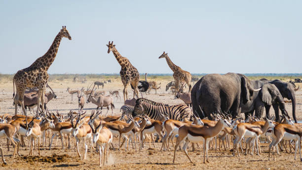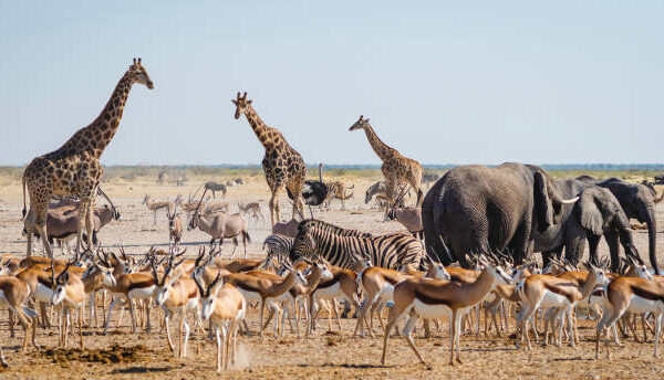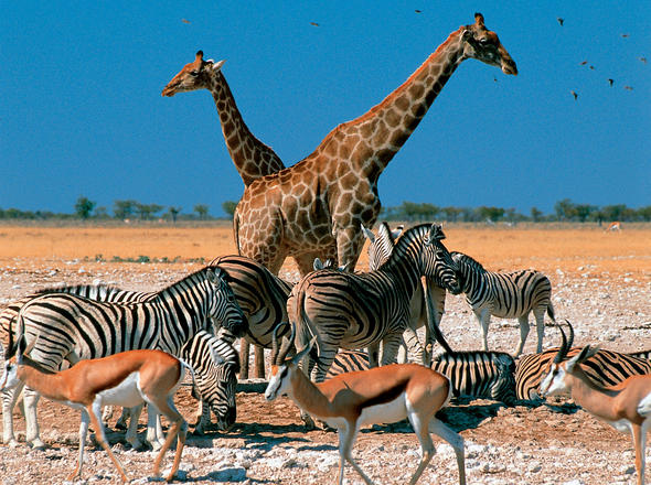 Start your day with mouth-watering breakfast, visit the UNESCO World Heritage Site of Twyfelfontein. Head to the remarkable petroglyphs* of wild animals including rhinos, elephants, giraffes, and zebras were created over 2,000 years ago by ancient hunter-gathers. Then, onto Damara Living Museum to gain insight into one of the oldest traditional nations in Namibia. Enjoy lunch before visiting the Petrified Forest, a unique site consisting of large fossilized tree trunks that are about 300 million years old. Continue to Etosha National Park ** in the vast arid space of Northern Namibia. One of the most important reserves, and wildlife sanctuaries in Africa, the park is centred on the white salt Etosha Pan that dominates the landscape. In the afternoon, embark on an open vehicle game drive. Observe the perennial springs and waterholes within the park that allow the predominant desert environment to support an incredible diversity of wildlife